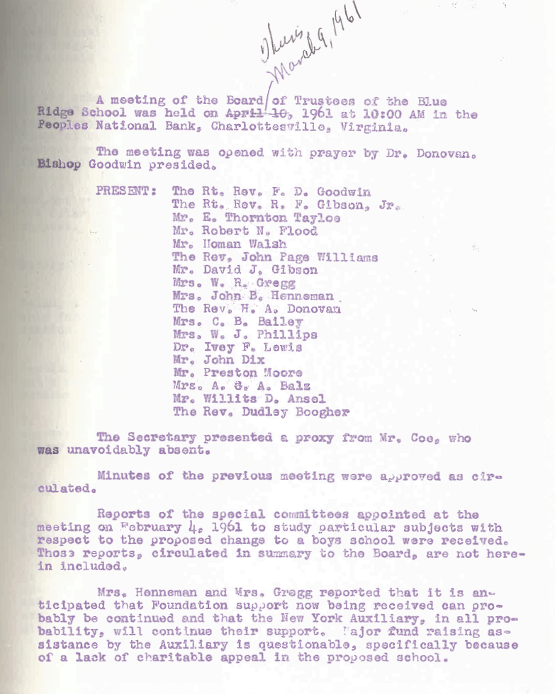 Blue Ridge School hired Mrs. Alice Wesley Ivory, its first African-American teacher. She led the Art Department and her own work was displayed in the Virginia Museum of Fine Arts.