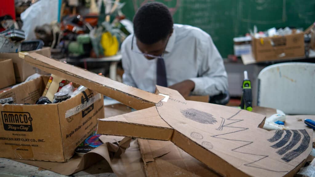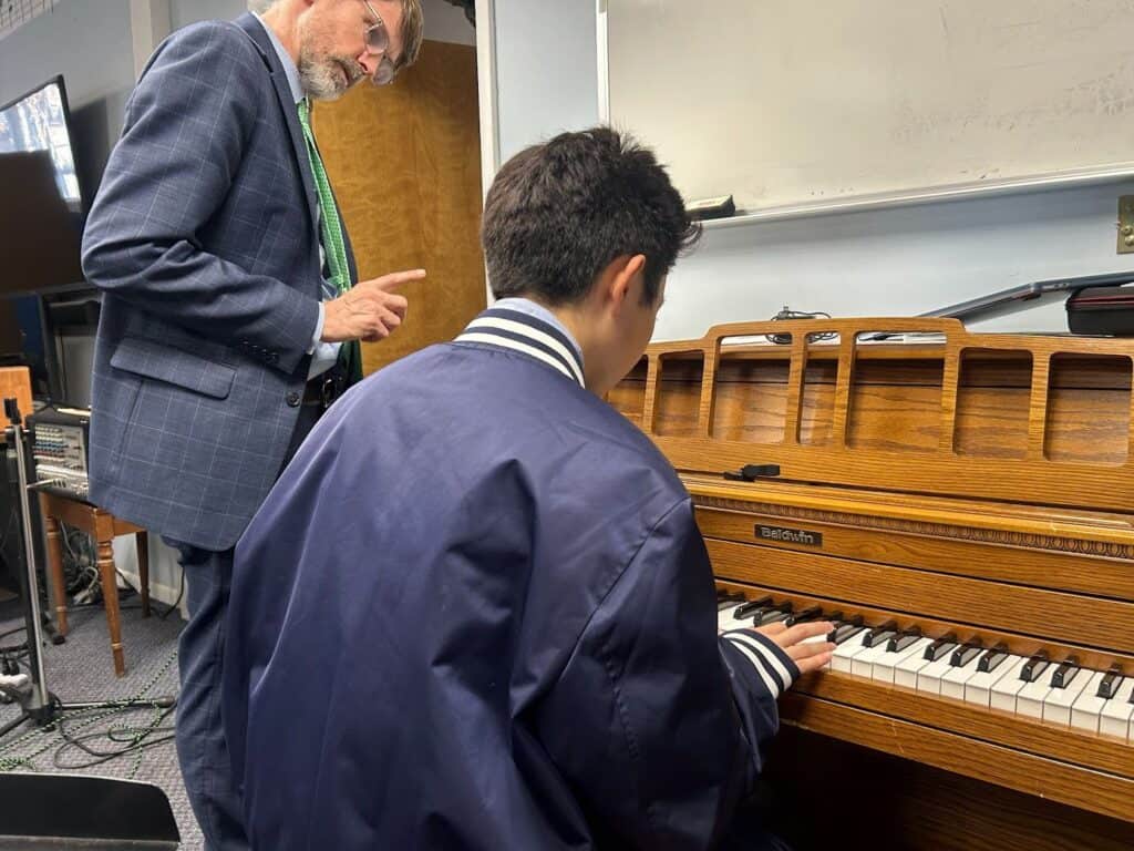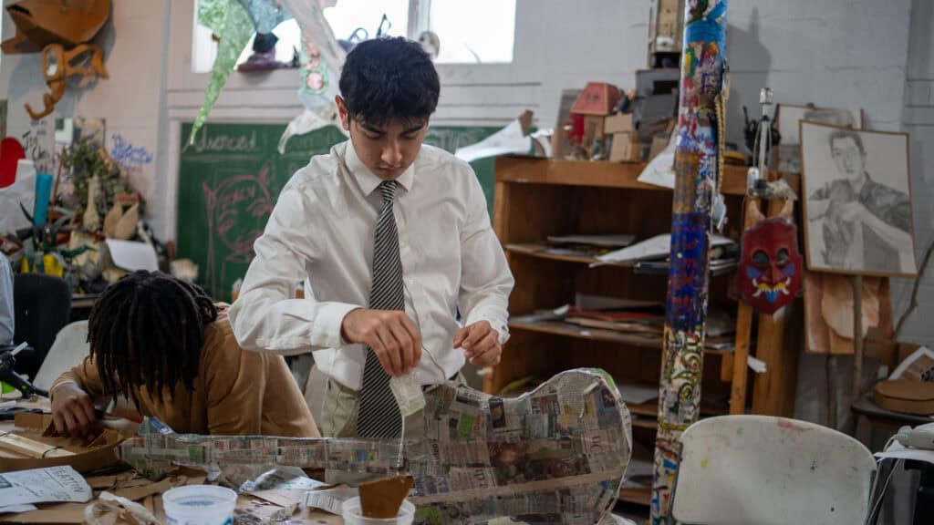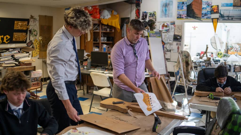 The visual and performing arts wing at Blue Ridge School is often alive with creativity. On my most recent visit, I heard the beginner music class putting on a spirited rendition of “Na Na Hey Hey Kiss Him Goodbye.” Just around the corner, studio art classes were designing custom cardboard guitars inspired by their favorite songs and bands, matching the aesthetics and vibe of artists from Tupac to The White Stripes. Later that weekend, I caught our open mic night, where advanced musicians jammed together with original music, demonstrating talent on the guitar, bass, piano, drums, and through vocals.